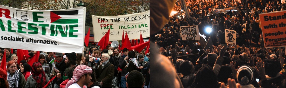 With this understanding, the Palestinian Liberation Movement and the Black Lives Matter Movement intentionally disrupt the “law and order” framework. From thrown rocks to shut down freeways, these liberation efforts have openly questioned the beneficiaries of a militarized police force. Recently, combined efforts have put these issues on the international agenda, proliferating upwards from university student groups, to community organizing, to the Bernie Sanders platform. The recent BLM platform stance actively supports the BDS Movement, condemns Israeli killing of Palestinians, and has brought the term ‘genocide’ to the forefront of American political discourse. These small discursive steps should not be diminished, and strategies like these will be critical as we look forward.