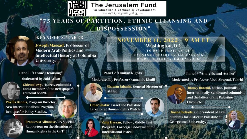 The Jerusalem Fund invites you to our Palestine Center Annual Conference titled, ‘75 Years of Partition: Ethnic Cleansing and Dispossession’ to be held on November 11, 2022, in Washington, D.C.