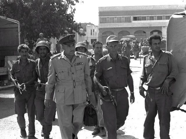 (Israeli soldiers accompany Major General al-Hassani after Gaza’s occupation in 1967)
