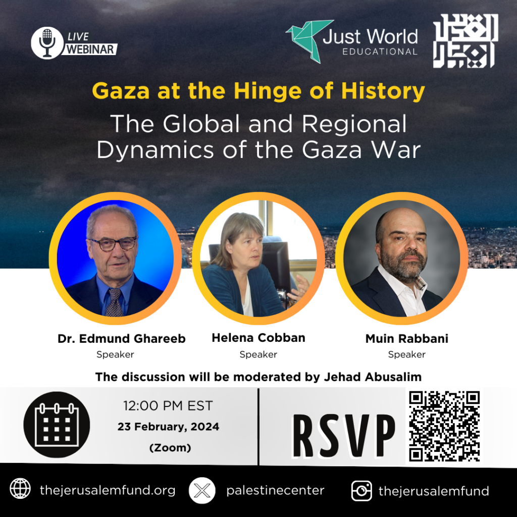 Join The Jerusalem Fund’s educational program, the Palestine Center, and Just World Educational for a discussion featuring Muin Rabbani, Helena Cobban, and Dr. Edmund Ghareeb as we explore the consequences of the ongoing genocide in Gaza, which has significantly influenced international relations and geopolitical and economic dynamics worldwide. The conversation will focus on the major changes and shifts in global and regional dynamics since October 7, with the aim of offering a thorough insight into the evolving international landscape in light of the Gaza war.